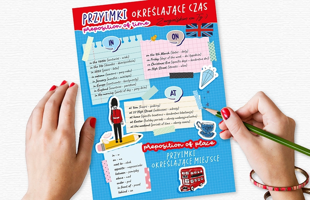 Dwustronna plansza/ściąga A4 - J. angielski przyimki