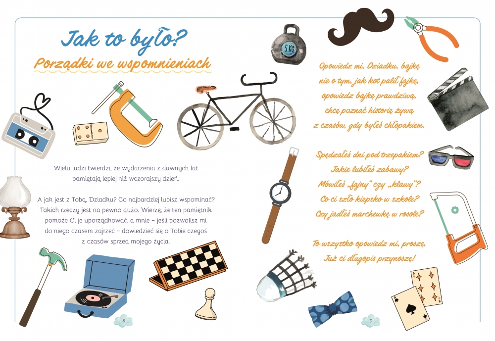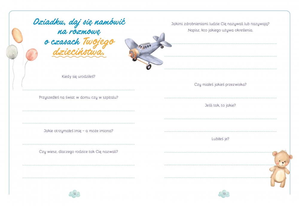 Każdy dziadziuś był kiedyś... dzidziusiem! Potem małym chłopcem, starszym chłopakiem, młodym mężczyzną, wreszcie - mężem i tatą. Coś zdobywał, osiągał, z czegoś był dumny. Do dziś to jego najcenniejsze wspomnienia! Odkryj je razem z dziadkiem dzięki jego zapiskom w tym albumie.