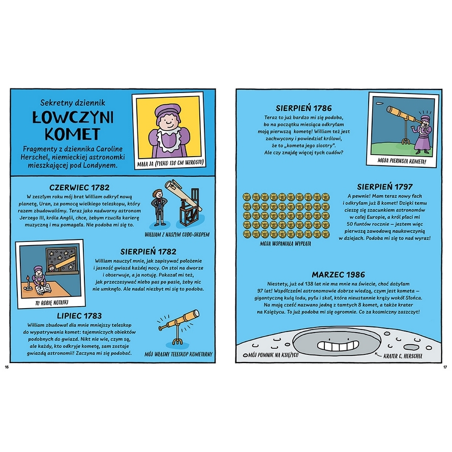Dzięki tej książce dowiesz się, jak łapać komety, kto odkrył witaminy, jak odnaleziono Pompeje i jaki związek mają krowy ze szczepionkami. Dzieje odkryć przedstawią ci nietypowi narratorzy: poznasz historię penicyliny z punktu widzenia… pleśni, posłuchasz opowieści psa z wyprawy Roalda Amundsena i dowiesz się, jak to jest być strzykwą i mieszkać na dnie Rowu Mariańskiego. Poznasz też wiele ważnych pojęć i zjawisk, jak choćby układ pierwiastków czy zmysł magnetyczny u zwierząt.
