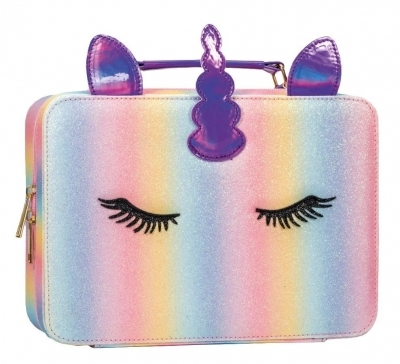 Etui do makijażu dziecięcego z wielobarwnym brokatem i jednorożcem zawiera: 12 cieni do powiek, 8 błyszczyków do ust, 2 lakiery do paznokci, pilnik.