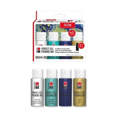 Zestaw do techniki Pouring Marabu Super Cell Pouring Set. Twórz wyjątkowe dzieła sztuki bez zbędnych przygotowań! Zestaw Super Cell Pouring umożliwia szybkie i łatwe tworzenie unikalnych obrazów pouringowych. Farby są już optymalnie dobrane i mają idealną płynność, dzięki czemu nie wymagają stosowania dodatkowych mediów ani oleju silikonowego. Produkt jest odpowiedni do wszystkich popularnych technik wylewania farb. Ważne: Farby mogą się z czasem osadzać, dlatego przed użyciem należy je dobrze wstrząsnąć lub wymieszać. Zawartość zestawu 4 x 60 ml Pouring Mix: tytanowa biel, aqua zielony, ciemny niebieski, złoty. Za pomocą tego zestawu stworzysz obraz pouringowy o rozmiarze około 30 x 40 cm, w zależności od rodzaju podłoża i wybranej techniki. Marabu Super Cell Pouring Set to doskonały wybór dla wszystkich, którzy pragną szybko osiągnąć imponujące rezultaty bez konieczności żmudnego przygotowywania i mieszania farb.