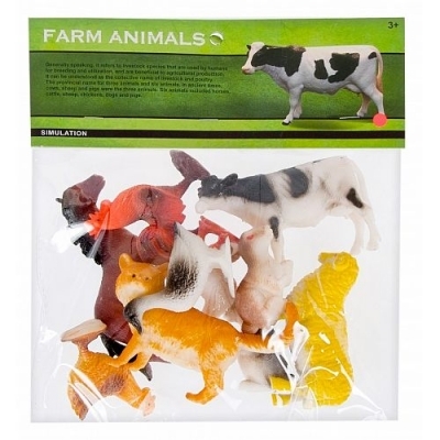 Zestaw 10 szt. zwierząt domowych w worku. W zestawie: owca, koń, kogut, kura, krowa, gęś, kaczka, królik, zając, kot.