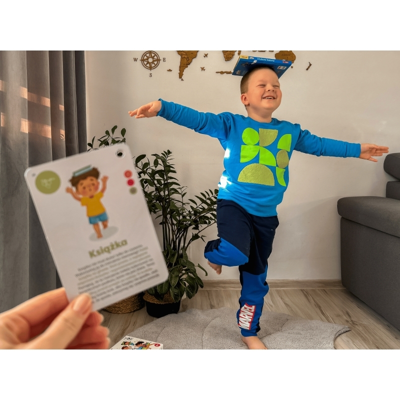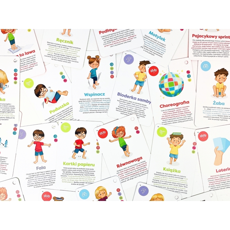 W pudełku aż 50 pięknie ilustrowanych kart z ćwiczeniami. Kolorowe koło losujące wprowadza element niespodzianki i emocji, dzięki czemu każda rozgrywka wygląda inaczej! Możesz grać w pojedynkę, z przyjaciółmi lub całą rodziną – w duchu rywalizacji lub współpracy.