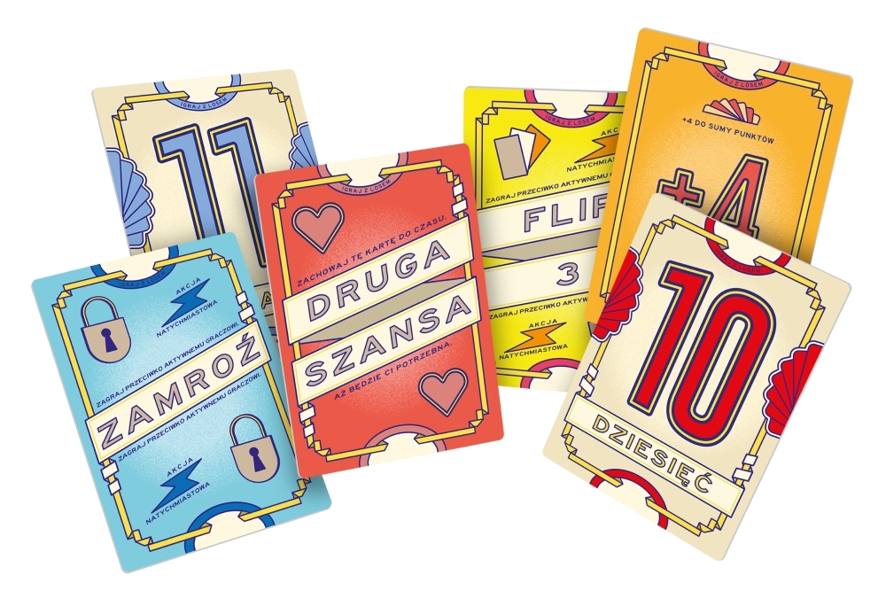 - Do zabawy wykorzystujemy specjalną talię kart z liczbami. Im większa liczba na karcie, tym więcej egzemplarzy tej karty znajduje się w talii. Oprócz tego kryją się tam specjalne karty modyfikatorów, które powiększają nasz dorobek punktowy, a także 3 rodzaje kart akcji, które mogą uratować nas w kryzysowej sytuacji, zmuszą jednego z graczy do dobrania aż 3 kart na raz albo pozwolą natychmiastowo zamrozić czyjąś rundę.