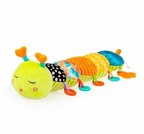 Kolorowa gąsieniczka grzechocze wesoło, zachęcając maluchy do wspólnej zabawy! Poszczególne segmenty jej ciałka uszyte zostały z materiałów o różnych fakturach, w tym takiego, który szeleści, a wszystko po to, aby stymulować zmysły dziecka, wpływając korzystnie na rozwój jego zdolności poznawczych. Zabawka wyposażona została w gryzaczek, kolorowe kółeczka oraz grzechotkę, ukrytą w ostatnim segmencie. Na brzuszku gąsienicy znajduje się miarka w centymetrach i calach, którą można wykorzystać do wesołych zdjęć dziecka z zabawką, a gdy maluch podrośnie - do nauki liczenia.