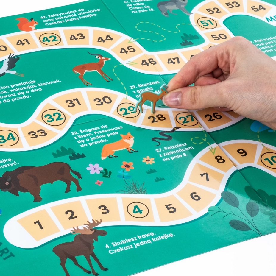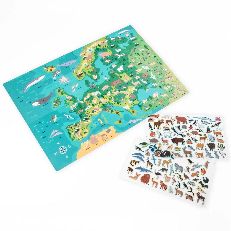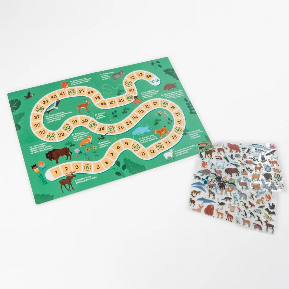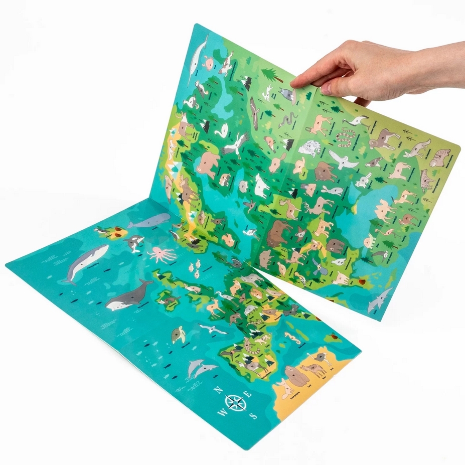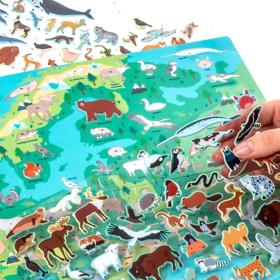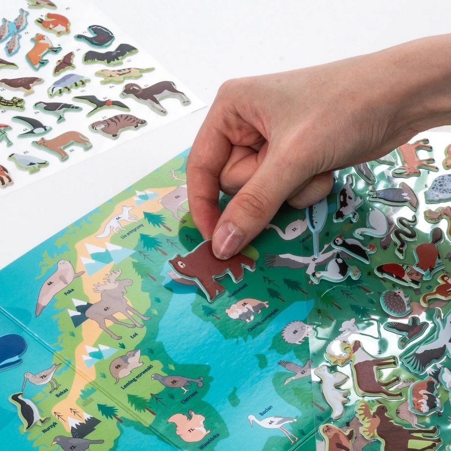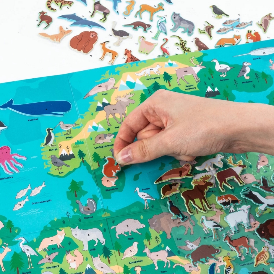 Zachwyć się maskonurami w malowniczej scenerii Islandii, majestatycznymi łosiami przemierzającymi bezkresy szwedzkich lasów oraz żubrami królującymi na polskich równinach. Zestaw zawiera naklejki ze zwierzętami, które można umieszczać na mapie zgodnie z oznaczeniami, aby zobrazować ich naturalne środowiska. Ta niezwykła zabawa rozwija jednocześnie wiedzę geograficzną i biologiczną.Dodatkowo, na odwrocie mapy czeka niespodzianka – wciągająca gra planszowa, która dostarczy wielu godzin rodzinnej rozrywki.