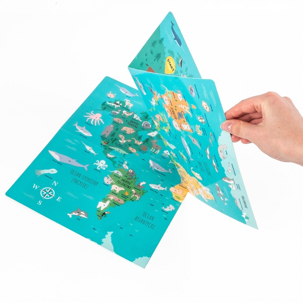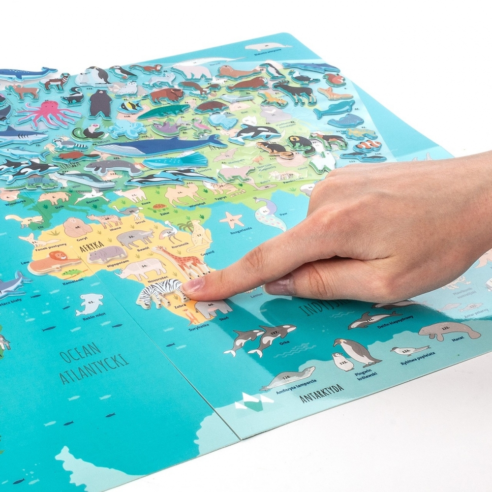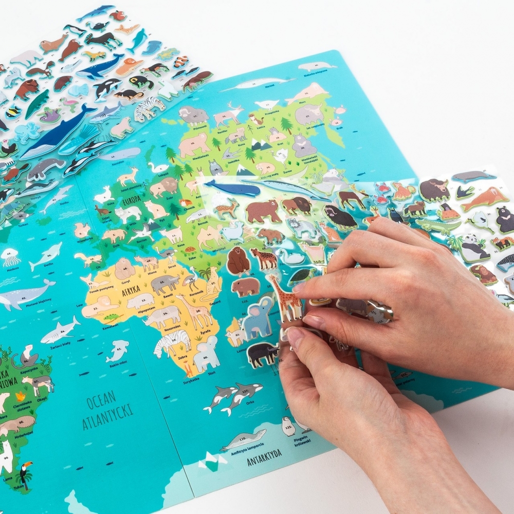 Poznaj pingwiny w lodowej scenerii Antarktyki, lwy na afrykańskich sawannach oraz kangury skaczące po australijskich równinach. Zestaw zawiera naklejki ze zwierzętami, które można umieszczać na mapie zgodnie z oznaczeniami, aby zobrazować ich naturalne środowiska. Ta niezwykła zabawa rozwija jednocześnie wiedzę geograficzną i biologiczną. Dodatkowo, na odwrocie mapy czeka niespodzianka wciągająca gra planszowa, która dostarczy wielu godzin rodzinnej rozrywki.