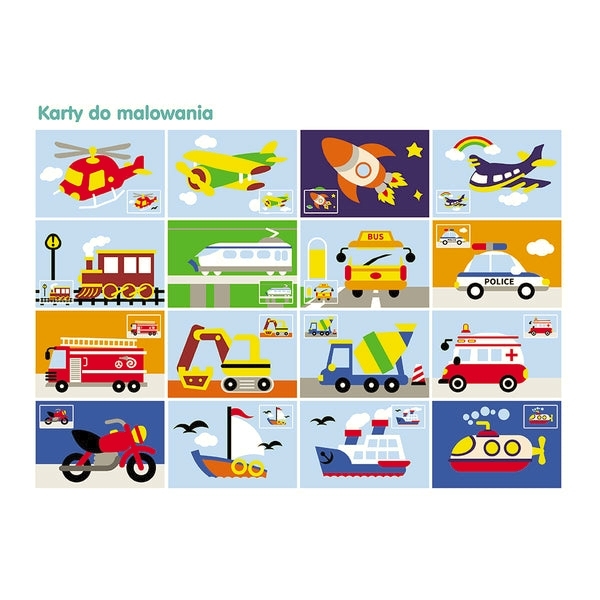 - Aż 16 obrazków – różnorodne obrazki z pojazdami gotowe do ozdabiania.