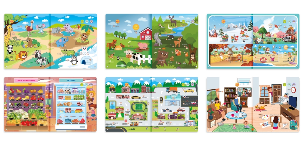 - Instrumenty, liczby, kolory, kształty, części ciała, ubrania, jedzenie, dom, miasto, pory roku i zwierzęta – cały świat w jednej książeczce!