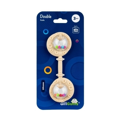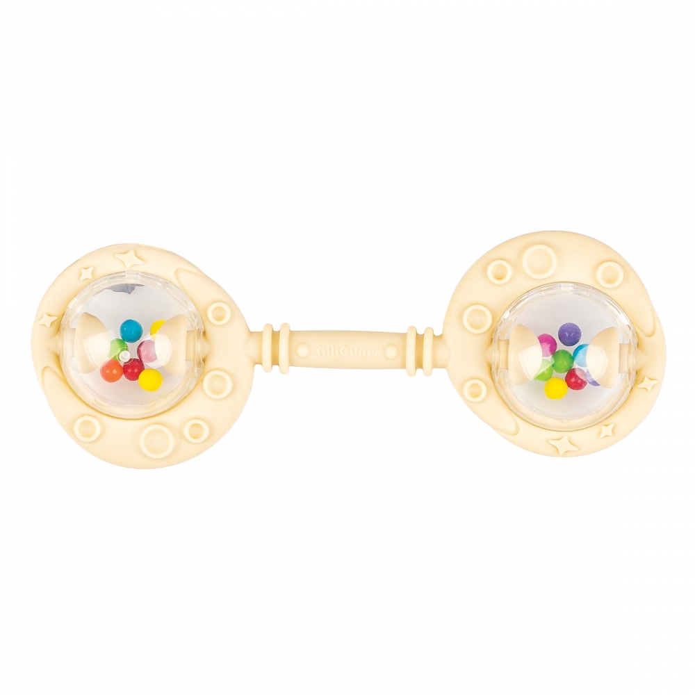 Pomysłowa zabawka w kształcie sztangi grzechocze podwójnie, zapewniając dwa razy lepszą frajdę! Wyposażona została w dwie kule wypełnione kolorowymi koralikami, które przy potrząsaniu wydają wesoły dźwięk. Obie kule otoczone są miękkimi pierścieniami z wypustkami o zróżnicowanych kształtach, które będą stymulować zmysł dotyku malucha, a podczas gryzienia, będą delikatnie masować obolałe ząbkowaniem dziąsła