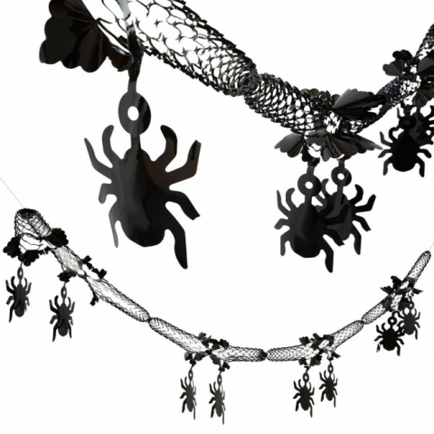 - Wzór: czarne pająki zawieszone na przestrzennej girlandzie.