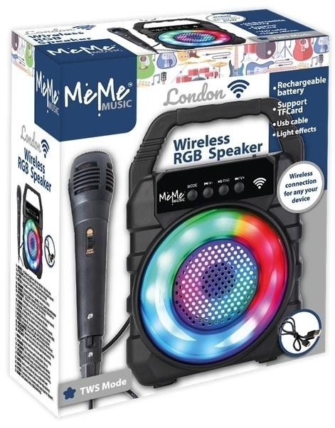 Bezprzewodowy wzmacniacz z efektami świetlnymi LED oraz mikrofonem. Wzmacniacz posiada gniazdo ładowania, karty TF, USB oraz mikrofonu. Możliwość odtwarzania radia. Przycisk odtwarzania i pauzy. Wybór następnego/poprzedniego utworu. Regulacja głośności. Możliwość połączenia dwóch wzmacniaczy.