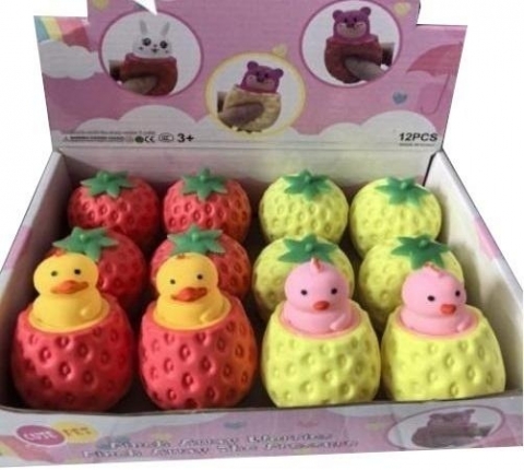 Odkryj uroczego gniotka antystresowego, który zachwyci każdego miłośnika słodkich gadżetów! Ten wyjątkowy gadżet przedstawia zabawnego kurczaczka, który wyłania się ze smakowitej truskawki - w zestawie znajdziesz zarówno czerwone truskawki z żółtymi kurczakami, jak i żółte ananasy z różowymi pisklętami, co dodaje im unikalnego charakteru. Wykonany z przyjemnego w dotyku, elastycznego materiału, jest idealny do ściskania, ugniatania i rozładowywania napięcia. Jego kompaktowy rozmiar sprawia, że możesz go zabrać ze sobą wszędzie - do szkoły, pracy czy w podróż. Gniotek ten to świetny sposób na poprawę humoru i redukcję stresu. Produkt dostępny jest w opakowaniu zbiorczym zawierającym 12 sztuk, co czyni go idealnym do dzielenia się z przyjaciółmi lub jako dodatek do upominków. Podana cena dotyczy jednej sztuki gniotka.