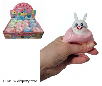 Zabawka gniotek w kształcie skorupki jajka. Po ściśnięciu ukazuje się zwierzątko (zając). Jajeczka w pastelowych kolorach w kwiatki. Produkt występuje w kilku wersjach kolorstycznych, wybierany losowo. Cena dotyczy jednej sztuki. Produkt zapakowany w przezroczysty worek.