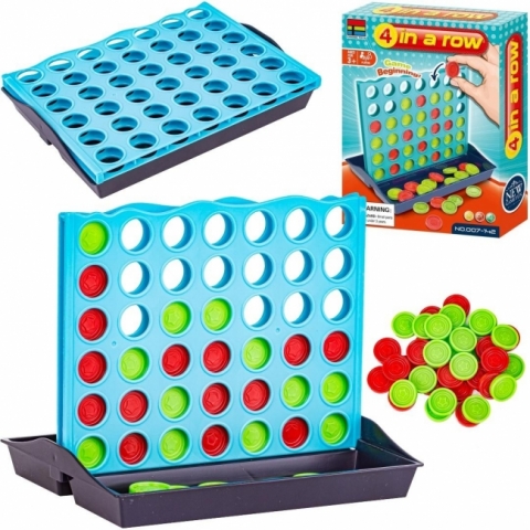 Zasady gry: Gra przeznaczona jest dla dwóch osób. Każdy gracz otrzymuje zestaw żetonów w jednym kolorze (czerwonym lub zielonym). Na zmianę wrzucacie po jednym żetonie do pionowej planszy. Waszym celem jest ułożenie czterech swoich żetonów w rzędzie - pionowo, poziomo lub na skos - zanim zrobi to przeciwnik.