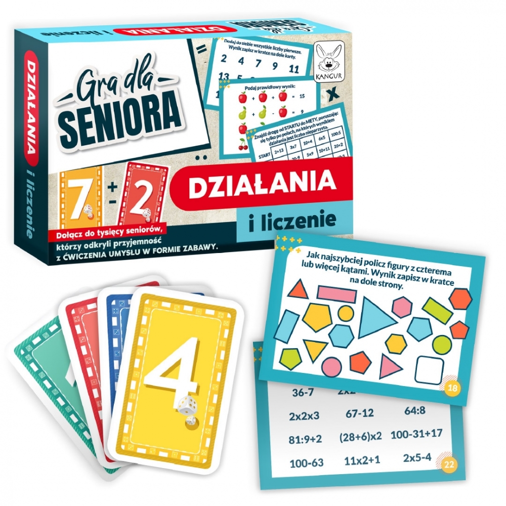 „Działania i liczenie” to angażująca gra edukacyjna przeznaczona dla seniorów, wspierająca sprawność umysłową, koncentrację oraz pamięć. Zestaw zawiera karty z działaniami liczbowymi, a także kości do gry, które umożliwiają różnorodne warianty zabawy oparte na liczeniu. Celem jest wykonywanie działań matematycznych w przyjemny sposób. Gra pomaga utrwalać umiejętności liczenia.