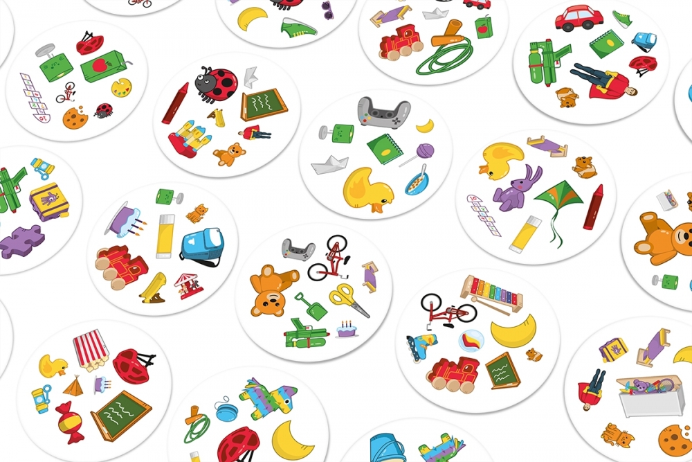 Dobble Kids to gra wspierająca trening spostrzegawczości i szybkości reakcji, w pełni dostosowana do potrzeb najmłodszych. Zestaw zawiera 55 kart z symbolami przedstawiającymi przedmioty i zabawki, którymi dzieci bawią się każdego dnia. Miś, plecak, piłka, rower, lalka – proste obrazki łatwiej nazwać, dzięki czemu możemy zaprosić do zabawy dzieci od 4. roku życia.
