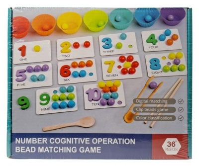 Gra edukacyjna – dopasowywanie cyfr i koralików. Zestaw do nauki liczenia i rozpoznawania kolorów. W komplecie znajdują się tabliczki z cyframi od 1 do 10, kolorowe koraliki do dopasowywania ilości, miseczki do sortowania, łyżeczka oraz szczypce do chwytania elementów. Zabawka wspiera naukę liczb, koordynację ręka-oko oraz klasyfikację kolorów. Produkt dla dzieci od 3 lat. Gra zapakowana w kartonowe pudełko. Podane wymiary są wymiarami opakowania.