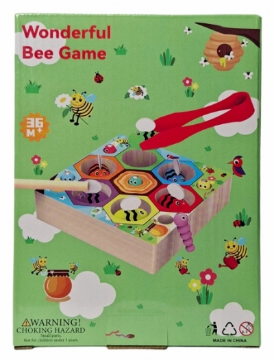 Gra zręcznościowa Wonderful Bee Game. Zabawa polega na chwytaniu i dopasowywaniu pszczółek do odpowiednich miejsc na planszy. Zestaw zawiera drewnianą planszę z otworami, kolorowe elementy z pszczółkami oraz szczypce do wyjmowania elementów. Gra przeznaczona dla dzieci od 3 lat. Produkt zapakowany w kartonowe opakowanie.