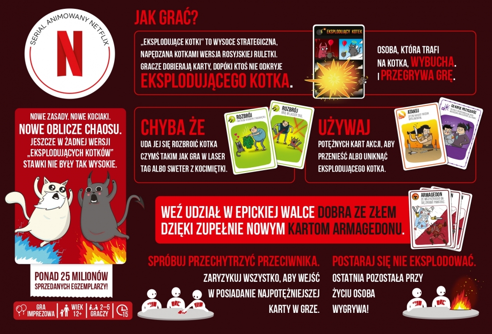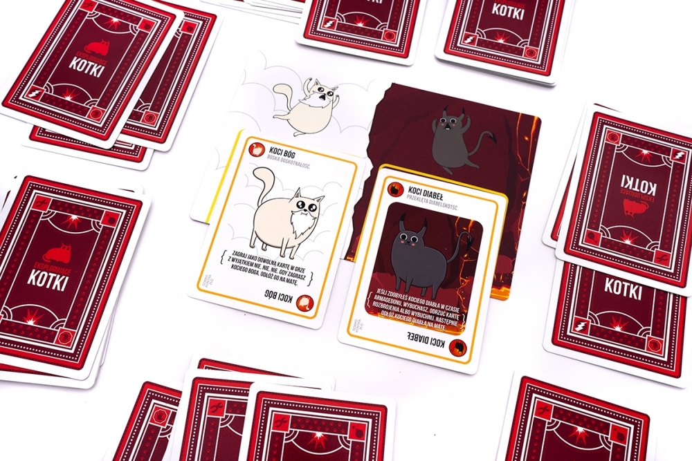 Ta alternatywna wersja podstawowych Eksplodujących Kotków zawiera 55 kart, z których część opisuje nieznane dotąd efekty. Do gry dołącza także Koci Bóg i Koci Diabeł oraz powiązane z nimi karty Armagedonu. Od tej pory możesz wywołać swój mały koniec świata, w którym rzucisz wyzwanie jednemu z przeciwników. Stawka jest wysoka: jeden z Was zyska najpotężniejszą kartę we wszechświecie, a drugi… cóż, jest ryzyko, że nie wyjdzie z tego żywy.