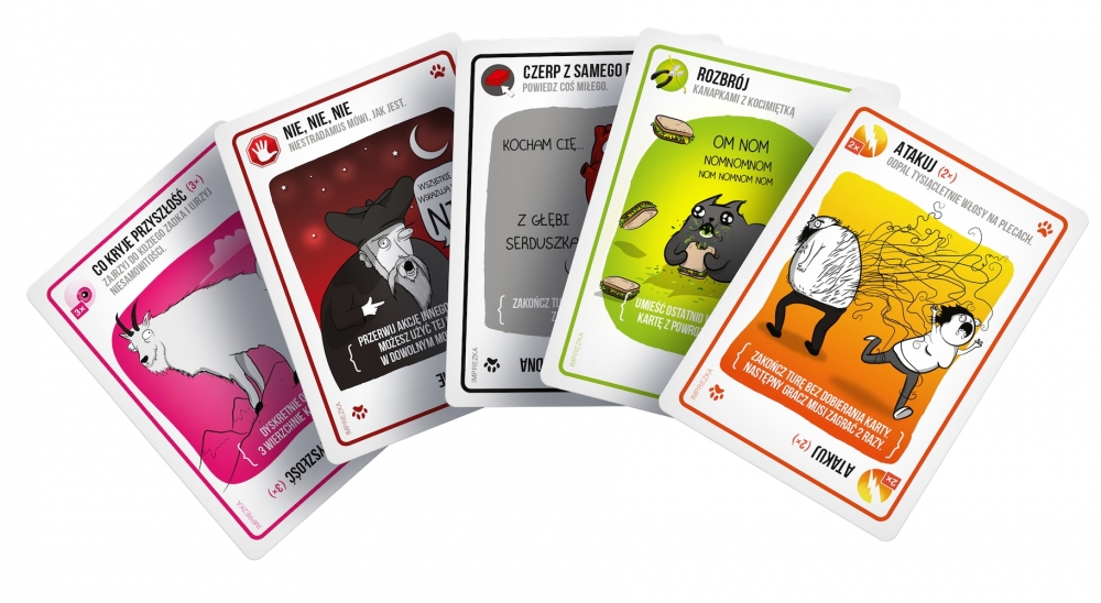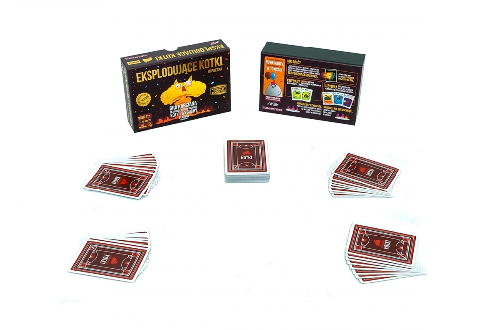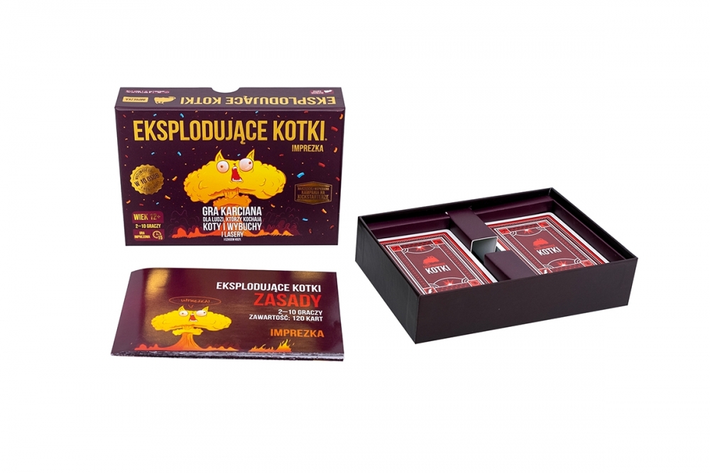 Eksplodujące Kotki: Imprezka to rozbudowana wersja popularnej karcianki zawierająca aż 120 kart i pozwalająca na zabawę aż 10 osobom jednocześnie! Co więcej, powiększona talia kryje też zupełnie nowe efekty, dzięki którym możemy przeprowadzać precyzyjnie wymierzone ataki, wpływać na przyszłość, a także sięgać na sam spód talii w poszukiwaniu szczęścia.
