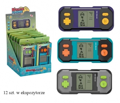 Przenośna gra elektroniczna z wyświetlaczem LCD i przyciskami sterującymi. Urządzenie posiada różne tryby gry inspirowane klasycznymi grami zręcznościowymi. Łącznie zawiera 26 gier. Kompaktowy rozmiar pozwala na zabranie gry w podróż lub korzystanie z niej w dowolnym miejscu. Produkt występuje w kilku wersjach kolorystycznych, wybierany losowo. Cena dotyczy jednej sztuki. Produkt dla dzieci od 3 lat. Zabawka zapakowana w kartonowe opakowanie. Podane wymiary są wymiarami opakowania.