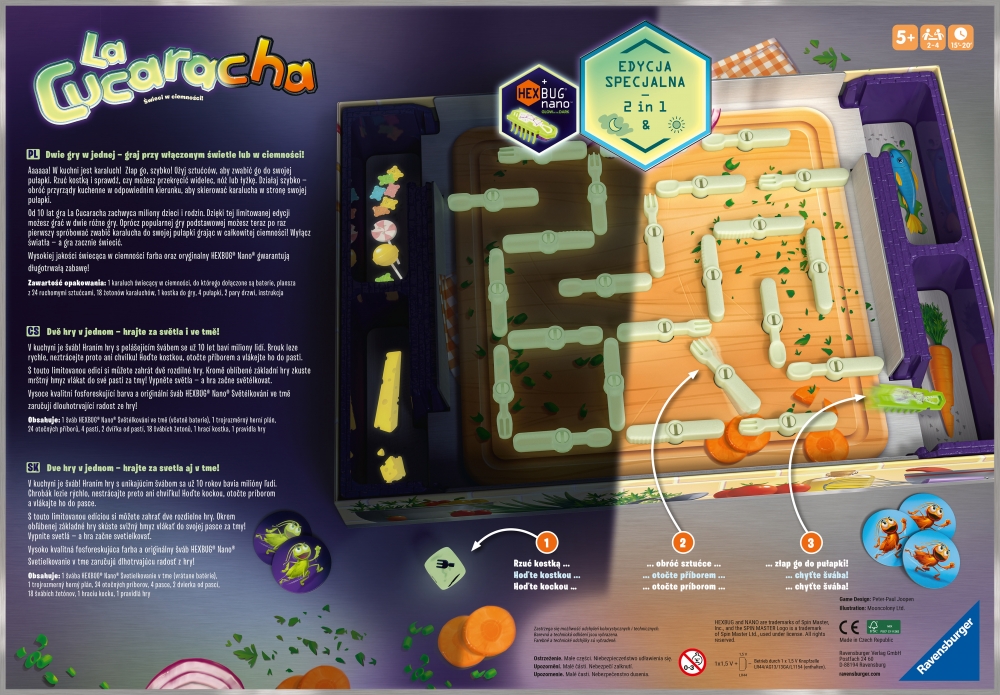 Wyłącz światła, a karaluch, kości, sztućce i pułapki zaczną świecić, więc możesz bawić się przy włączonym lub wyłączonym świetle! Tylko ci, którzy szybko zakręcą świecącymi w ciemności sztućcami, mogą zwabić karalucha do jednej z czterech kuchennych pułapek. Za każdym razem, gdy karaluch zostanie złapany, zbierz świecący w ciemności chip. Pierwszy gracz z pięcioma żetonami wygrywa upiorne polowanie na świecącego w ciemności elektronicznego karalucha!
