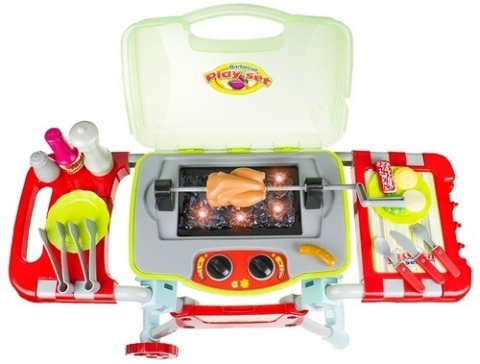 Grill z akcesoriami, bogato wyposażony z efektami świetlnymi i dźwiękowymi to super propozycja dla dzieci powyżej 3 roku życia. Podczas prawdziwego grillowania Twoja pociecha będzie mogła przyrządzać własne potrawy na swoim pełnym ciekawych akcesoriów i efektów grilu. Zabawie towarzyszą światła i dźwięki palącego się węgla uruchamiane jednym z pokręteł. Drugie pokrętło uruchamia funkcję obracania rożna. Prawdziwa frajda dla małego fanatyka letniego grillowania .