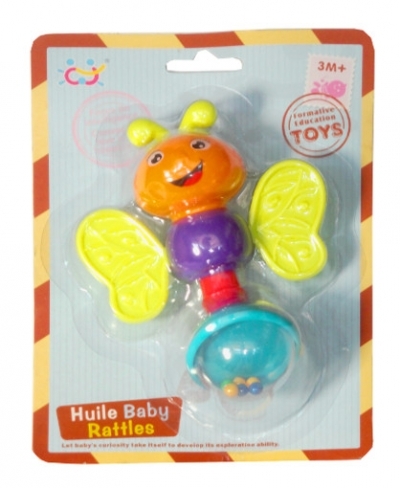 Kolorowa grzechotka motylek z ruszającymi się skrzydełkami. Idealne dla uspokojenia niemowlaka. Zabawka zabezpieczona kartonową podstawką i plastikowym przezroczystym kloszem. Zabawka przeznaczona dla dzieci powyżej 3 miesięcy.