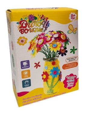 Dzięki kolorowym guziczkom, filcowym kwiatuszkom i drucikom dziecko może zaprojektować swój własny, niepowtarzalny bukiet. Gotowe kwiaty umieszcza w dołączonym wazoniku, który samodzielnie przyozdabia, tworząc piękną dekorację pokoju lub prezent dla bliskiej osoby.