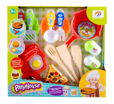 Zestaw naczyń, w skład którego wchodzą dwie patelnie, dwa talerze, solniczka, pieprzniczka oraz inne akcesoria kuchenne.