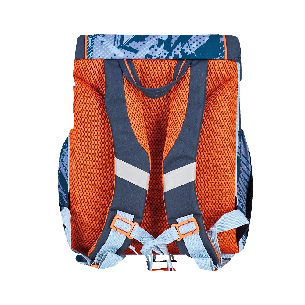 Model ten wyróżnia się bardzo niską wagą – poniżej 1 kg, a jego usztywniona, stabilna konstrukcja pomaga dziecku w utrzymaniu prawidłowej postawy i ułatwia organizację szkolnych przyborów. Zastosowanie ergonomicznie ukształtowanych pleców z przepuszczającego powietrze materiału oraz regulowanych szelek i pasa piersiowego zapewnia idealne dopasowanie do sylwetki dziecka i komfort noszenia przez cały dzień. Tornister dba również o bezpieczeństwo – duże powierzchnie odblaskowe umieszczone z przodu, po bokach i na szelkach poprawiają widoczność ucznia po zmroku, a dodatkowy odblask na klamrze zatrzaskowej zwiększa ochronę w ruchu drogowym.