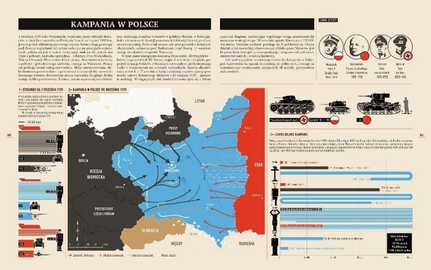Na II wojnę światową. Infografiki składają się czterech części: „Aspekt materialny i ludzki”, „Broń i armie”, „Kampanie i bitwy” oraz „Bilans strat i zniszczeń”. Opisują one sześćdziesiąt kluczowych tematów – jak problem zaopatrzenia w ropę naftową, struktura związków taktycznych i operacyjnych, operacja „Barbarossa”, logistyka walczących państw, wojna na Pacyfiku, eksploatacja okupowanej Europy, wojna na pustyni… – przedstawiających ten wielki globalny konflikt przystępnie, a zarazem nieszablonowo.