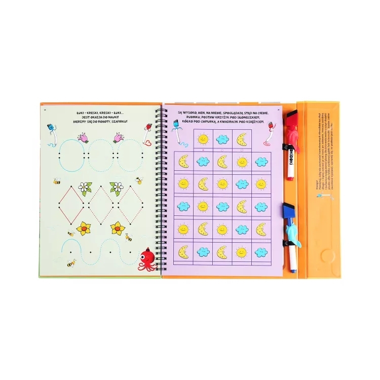 W zestawie: 50 stron z zadaniami (spiętych spiralą), 2 pisaki zmazywalne z gąbką nakładkami do prawidłowego chwytu.