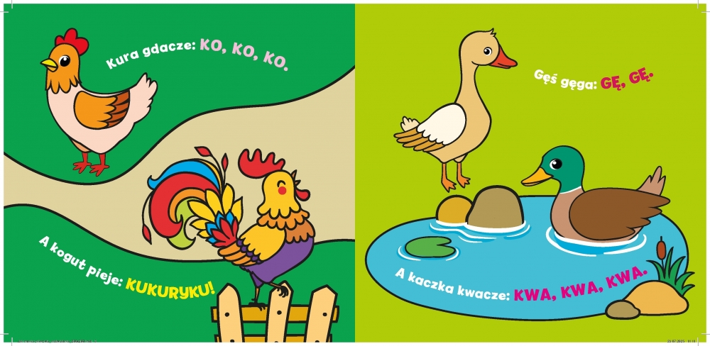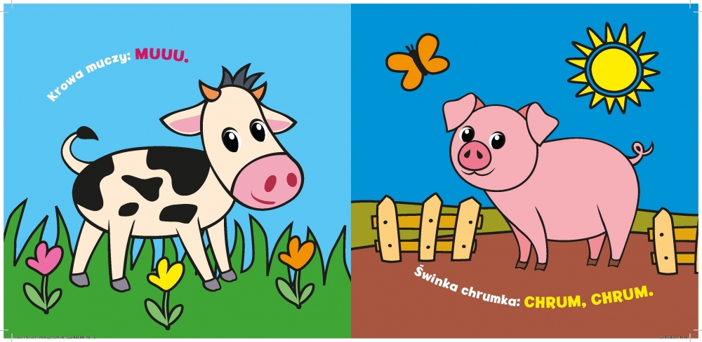 Miękka, lekka i bezpieczna, doskonale sprawdzi się już od pierwszych miesięcy życia. Ma szeleszczące kartki, które wydają delikatne dźwięki i zachęcają malucha do chwytania, ściskania oraz potrząsania. Na stronach znajdują się sympatyczne wiejskie zwierzęta oraz „język” każdego z nich – proste wyrazy dźwiękonaśladowcze, które wspierają rozwój mowy i słuchu. Dzięki kontrastowym, wyraźnym ilustracjom dziecko łatwiej skupia wzrok i poznaje otaczający je świat.