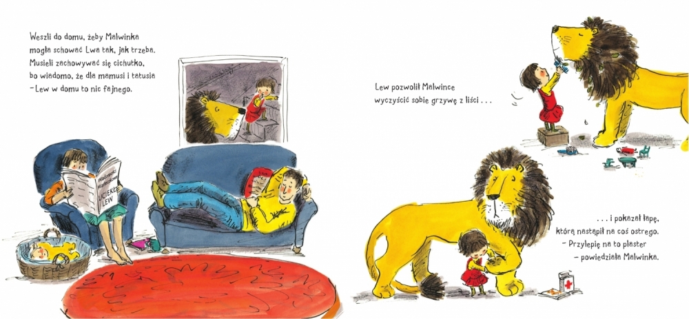 - Dzieci uwielbiają tę serię: cieszą się, bawią i wzruszają. Podziwiają piękne, oryginalne, wyraziste ilustracje i żywe kolory. Kibicują rezolutnym bohaterom w wyszukiwaniu i wymyślaniu kolejnych kryjówek przed rodzicami, przed nauczycielką, przed babcią i przekonują się, że to jest dobry Lew, który chce wszystkim pomagać i chroni Malwinkę.