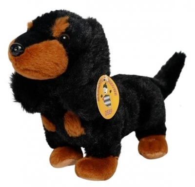 Nasz pluszowy jamnik to wiernie odwzorowana maskotka o długim tułowiu i krótkich łapkach, charakterystycznych dla tej rasy. Uszy są miękkie i oklapnięte, a czarno–brązowe futerko sprawia, że wygląda niezwykle realistycznie. Piesek ma sympatyczny pyszczek i błyszczące oczka, które nadają mu przyjazny wygląd.