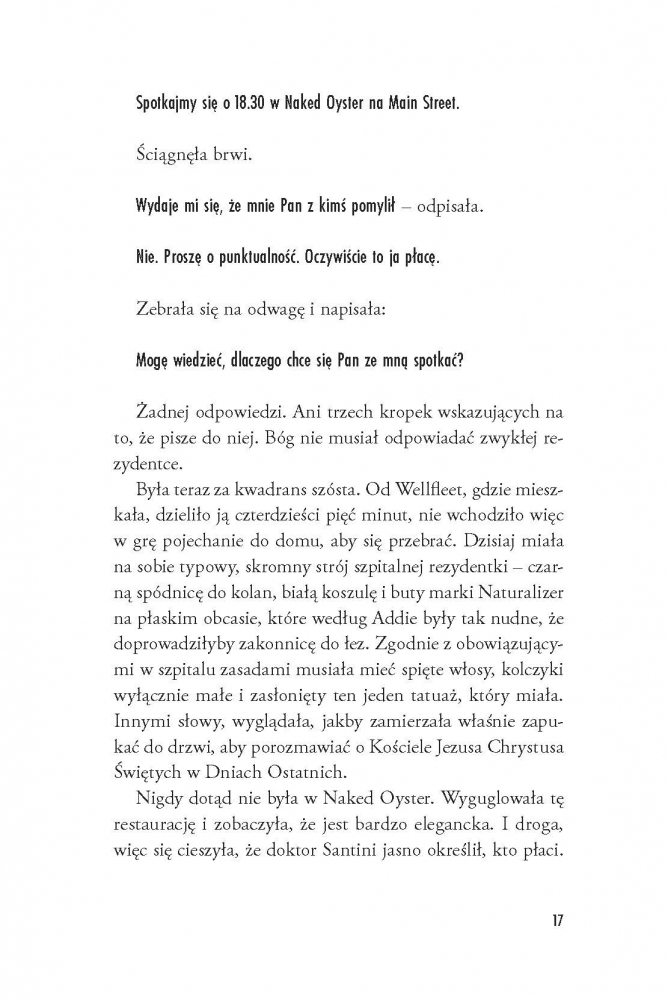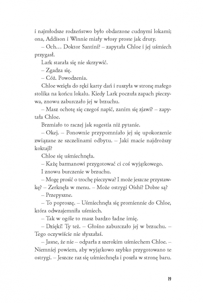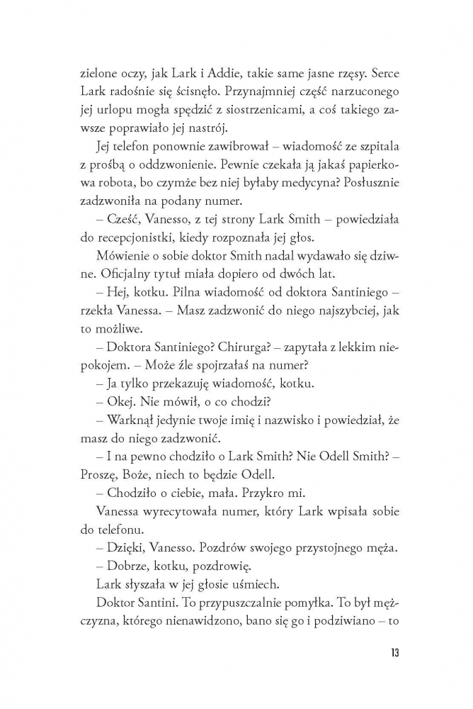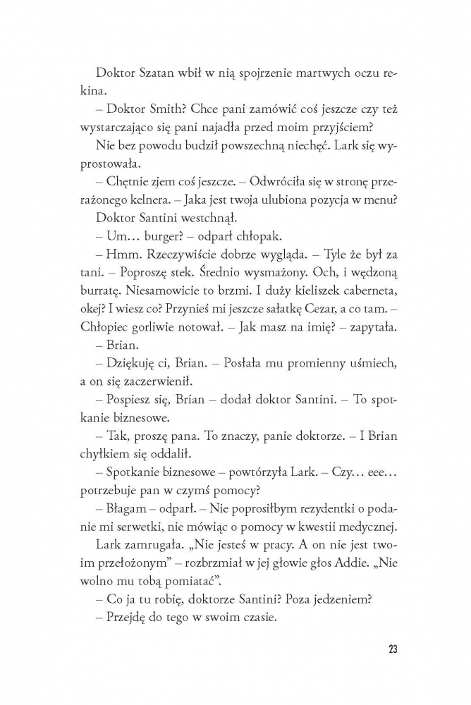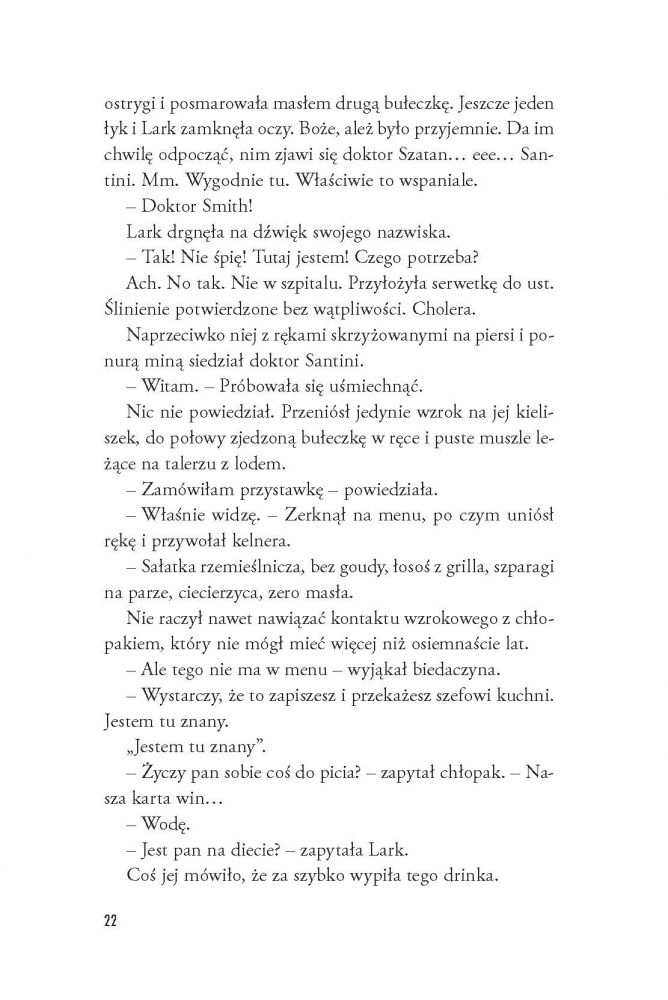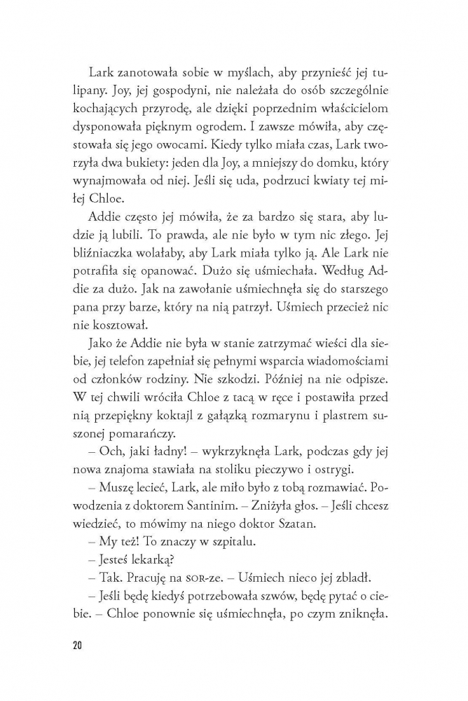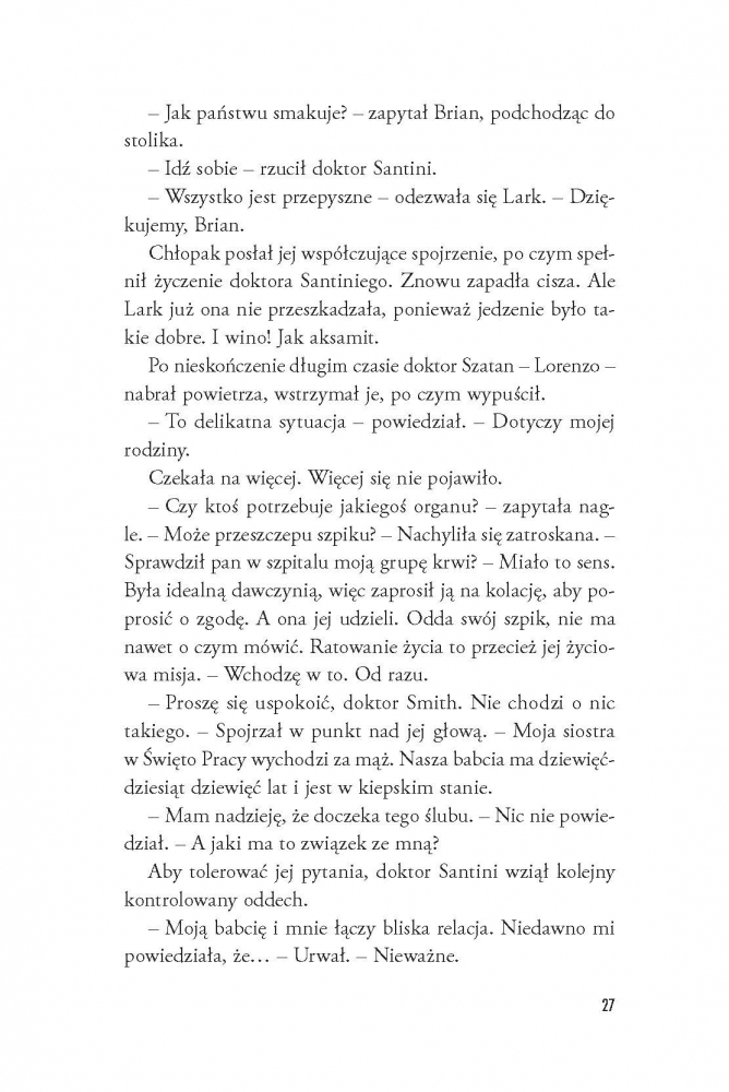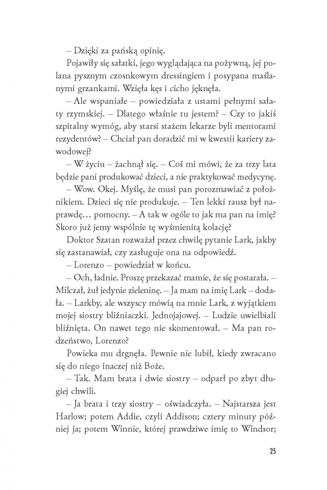 Pomoc zjawia się z najmniej spodziewanej strony – znakomity chirurg Lorenzo Santini (nieoficjalnie: dr Szatan) pilnie potrzebuje osoby towarzyszącej na ślub siostry. W zamian obiecuje ułatwić Lark powrót do pracy na oddziale onkologicznym. Nikt nie odrzuca takiej okazji, a już z pewnością nie Lark, która... od samego początku zakochuje się w rodzinie dra Szatana, a najbardziej w... No właśnie.