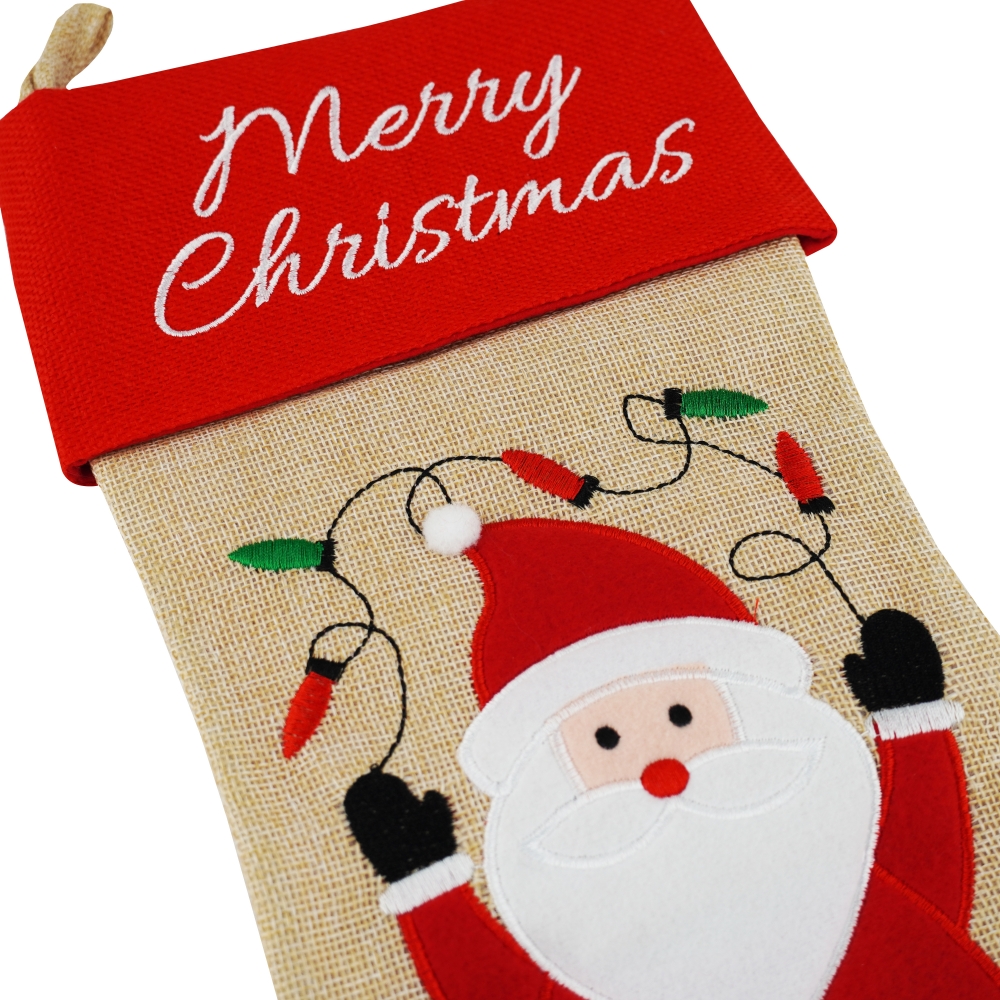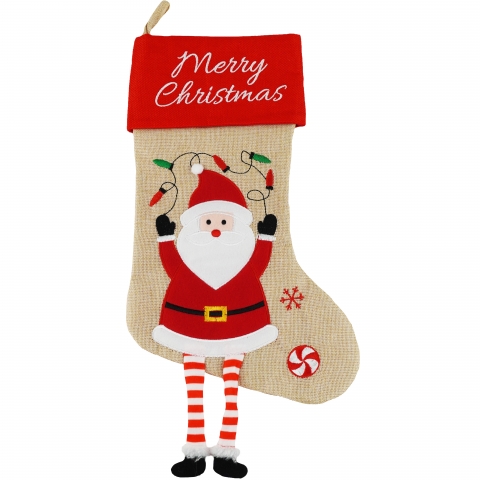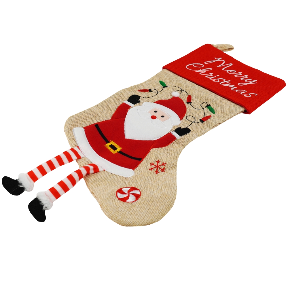 Świąteczna jutowa skarpeta na prezenty z Mikołajem i jego długimi zwisającymi nogami!