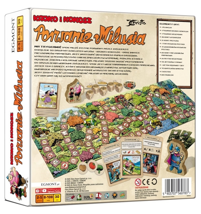Dołączcie do drużyny dzielnych wojów – Kajka i Kokosza – oraz innych mieszkańców Mirmiłowa, żeby uratować ukochanego pupila grodzian. Wyruszcie w pełną przygód i niebezpieczeństw wyprawę, podczas której będziecie zbierali kolorowe warzywa. Milusia trzeba skusić przysmakami do opuszczenia warowni Zbójcerzy. Smok jest wegetarianinem i kocha marchewki, zatem ten z graczy, który nazbiera najwięcej warzyw, wygrywa grę.