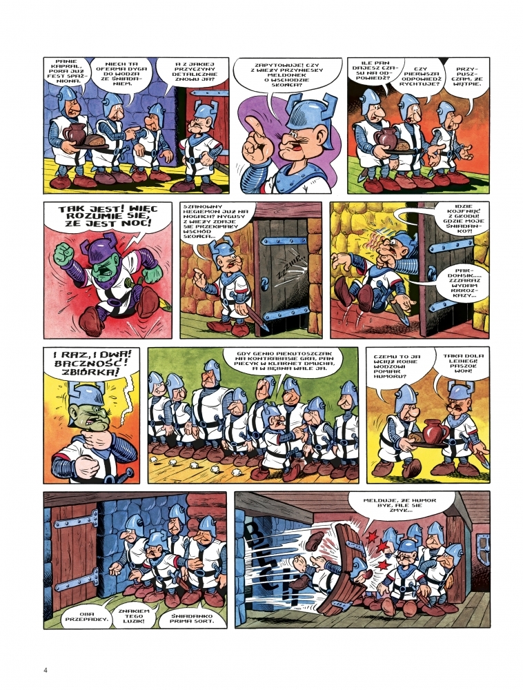 Nadchodzi czas turniejowych rozgrywek, dlatego kasztelan Mirmił z wielkiego frasunku na bolesność głowy zapadł. Nie dość, że na darmo okrzyknął soboty dniami wolnemi od roboty, bo ślubna i tak nie daje mu dłużej pokimać, nie może też w spokojności oddać się moczeniu kija, bo mieszkańce, raban okrutny podnosząc, skutecznie rybe we fosie płoszą, to jeszcze cwane Grandziarze zamiarują, co i raz obstalować nowe sposobność na totalne demolkie grodu.