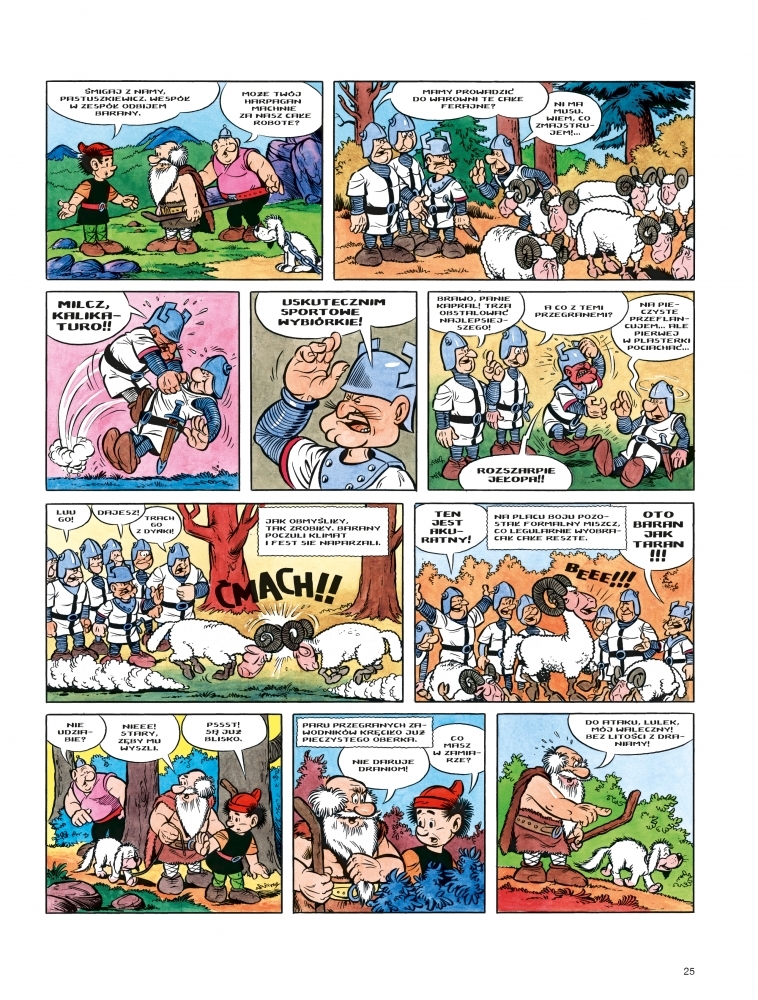 I jeszcze to Święto Barana! Każden jeden kasztelan, będący w zgodzie z tradycją, musowo wystawia w baranich zawodach własnego wyczynowca, a z tem akuratnie zupełnie na bakier. Całe szczęście są wierne wojaki Kajko i Kokosz, które w trymiga wywąchają w górskich dolinach osobnika skutecznie walącego ze łba. Kłopot w tem, że wystawienie rogatego swojaka umyślili tyż Grandziarze. Oj, będzie polka! Czasu mało, a turniejowa świąteczność tuż za winklem.