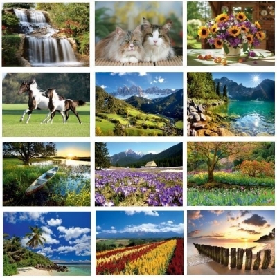 Kalendarium z imionami i bieżącą numeracją tygodni, drukowane na papierze offsetowym 70g/m2, 12 różnorodnych zdjęć do wyboru.