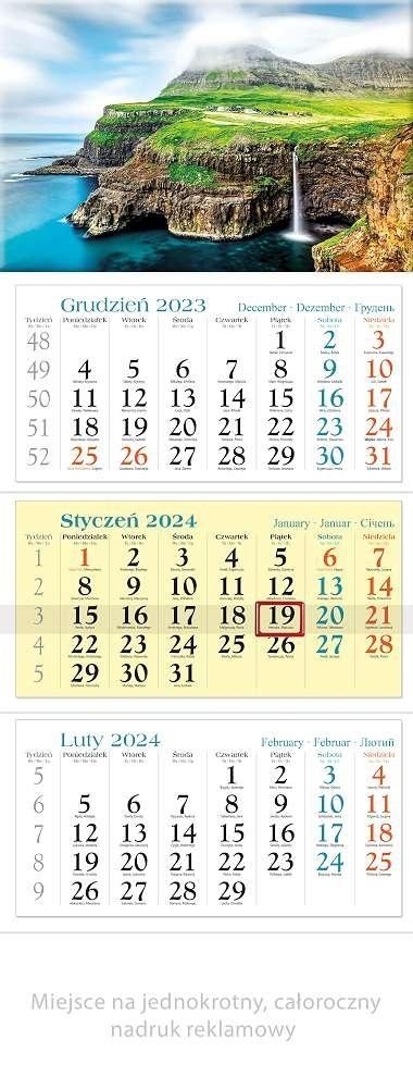 format kalendarza z "główką" i polem pod nadruk reklamowy 32 x 86 cm;