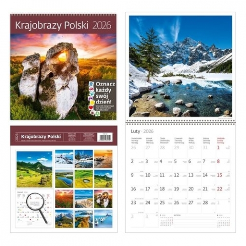 Kalendarz 2026 Krajobrazy Polski 30x30 z naklejkamiKalendarz ścienny miesięczny z dwunastoma zdjęciami - po jednym na każdy miesiąc. Duże kalendarium w języku polskim posiada oznaczenia świąt oraz imienin. Każde pole zawiera wystarczająco dużo miejsca na umieszczenie krótkiej notatki oraz oznaczenie dnia jedną z 300 naklejek z zestawu dołączonego na końcu kalendarza. Kolekcja naklejek obejmuje graficzne oznaczenia takich wydarzeń jak imieniny, urodziny, randka, wakacje, zakupy, wizyta u dentysty czy lekarza, mecz, siłownia, praca, impreza, teatr, muzyka, pies, kot.Wymiary: 30x30 cm, po rozłożeniu 30x60 cmSposób zawieszania - otwór w górnej części