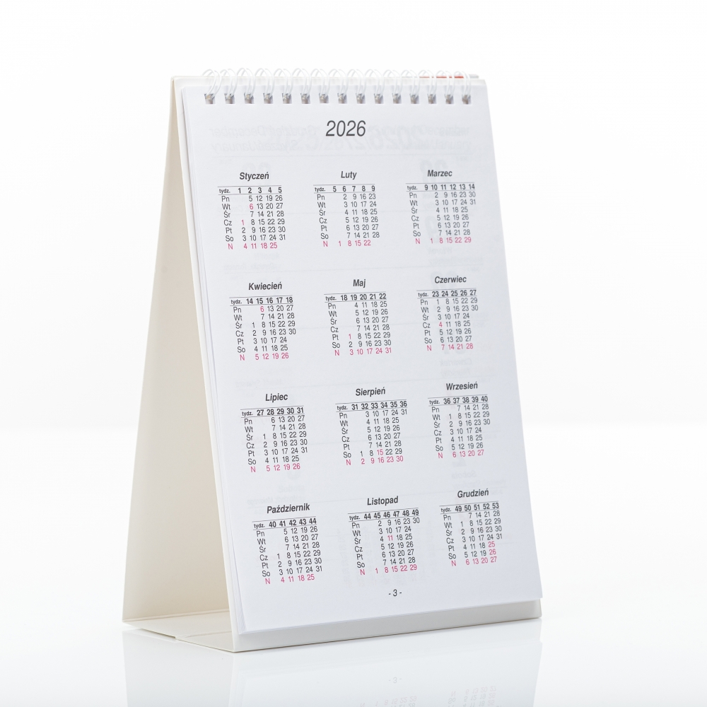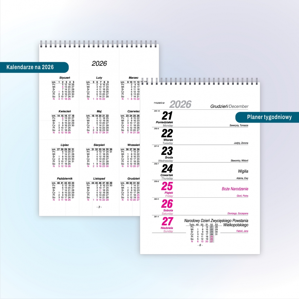 - Zawiera czytelne kalendarium z imieninami i Świętami w języku polskim