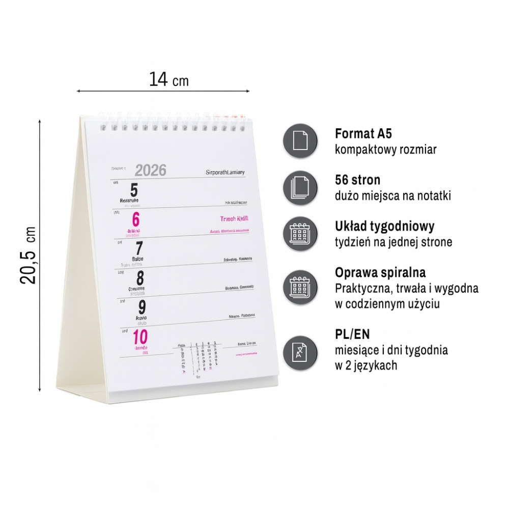 Kalendarz Biurkowy A5 tygodniowy Stojący to praktyczne i stylowe rozwiązanie zarówno do biura, jak i do domu. Dzięki kompaktowym wymiarom oraz przemyślanej konstrukcji doskonale komponuje się z każdą przestrzenią roboczą, dodając profesjonalnego charakteru Twojemu biurku.