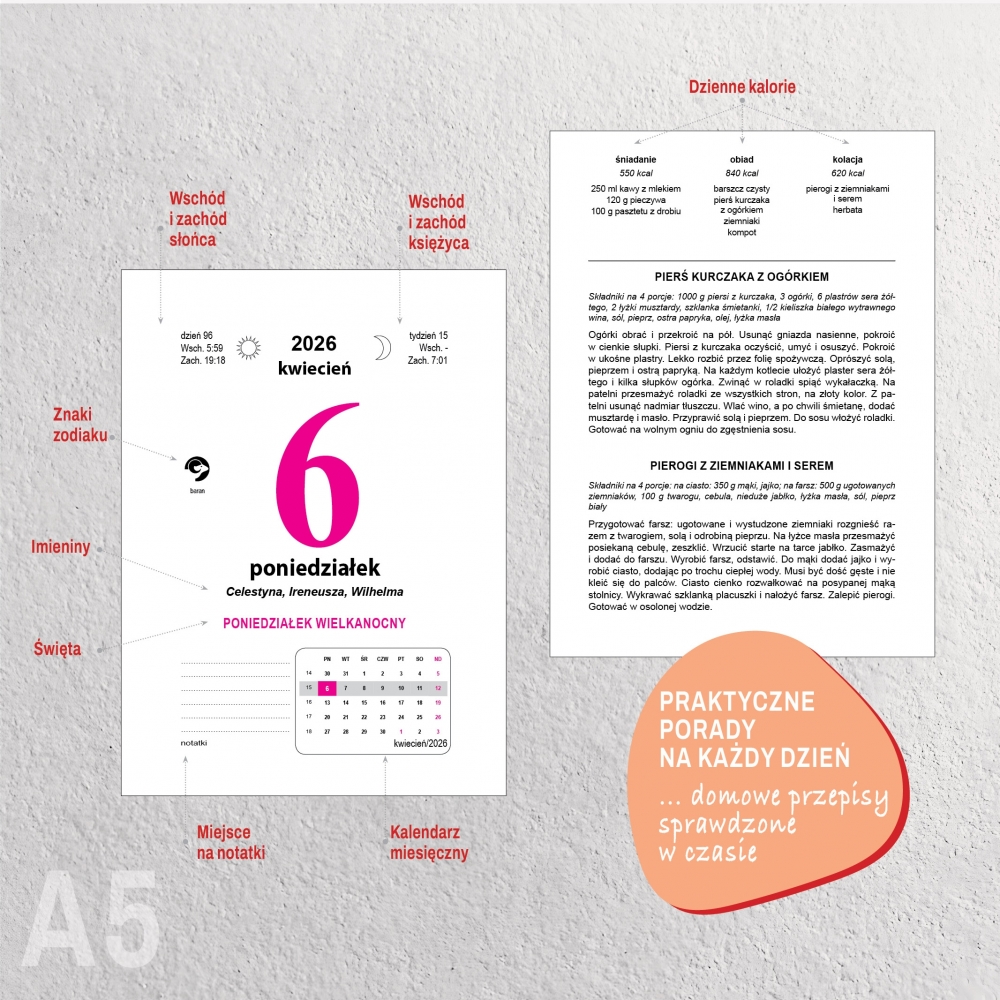 - Zawiera czytelne kalendarium z imieninami i Świętami w języku polskim
