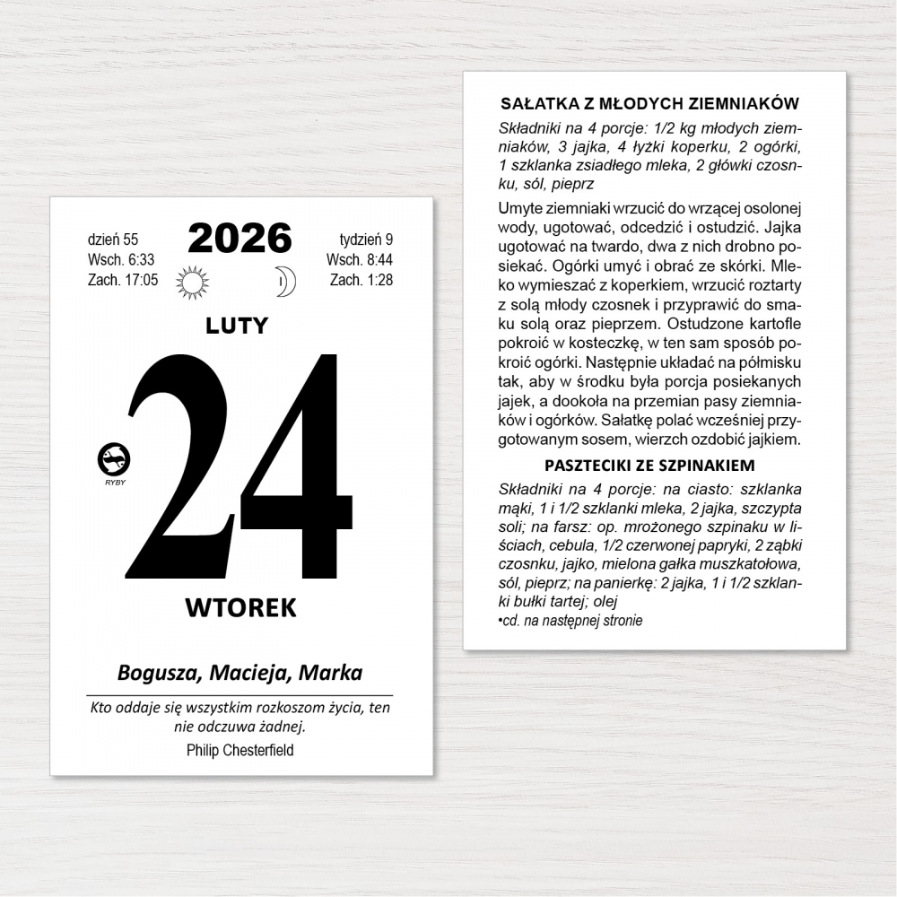 Codziennie znajdziesz w nim nowe cytaty, wiersze oraz interesujące fakty, które mogą dostarczyć inspiracji, wiedzy lub po prostu wywołać uśmiech. Dodatkowo kalendarz zawiera informacje o godzinach wschodu i zachodu słońca, co szczególnie docenią miłośnicy astronomii, fotografii czy osoby planujące dzień zgodnie z naturalnym rytmem.