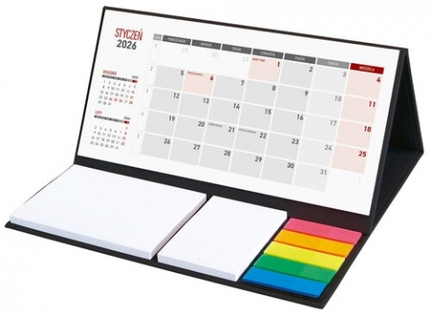 •nr katalogowy: KB064B•układ: miesięczny•format kalendarium: 204 x 99 mm•druk: 2+0•format kalendarza: 210 x 192 x 112 mm•foliowany pojedynczo Wygodny kalendarz stojący na biurko z przejrzystym kalendarium w układzie miesięcznym z poręcznymi karteczkami samoprzylepnymi do notowania. Przydatny zwłaszcza w biurze. W kalendarzu zaznaczono święta. Część informacyjna kalendarza zawiera:•Kalendarium 2026•Miesiąc bieżący, poprzedni i następny•Daty świąt•Samoprzylepne kartki do notowania•Kolorowe znaczniki
